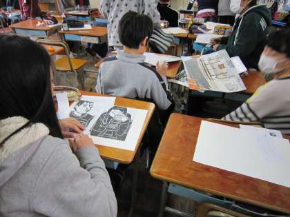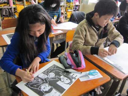 6年2組では,明日からの図工展で掲示する作品に名札をつけていました。