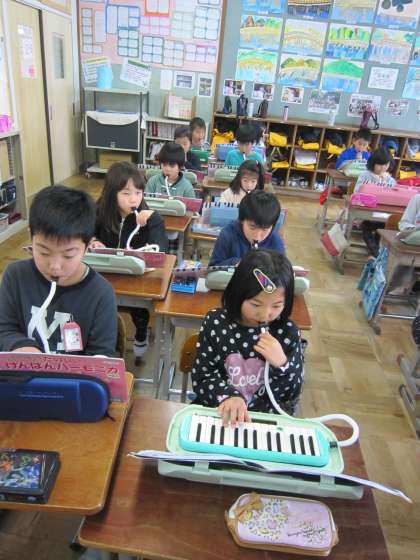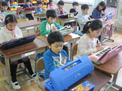 2年1組では,音楽の時間に鍵盤ハーモニカで「きよしこの夜」を2部で演奏しようと練習に励んでいました。