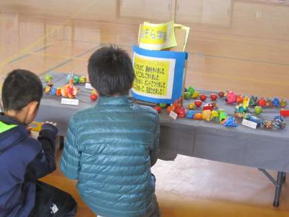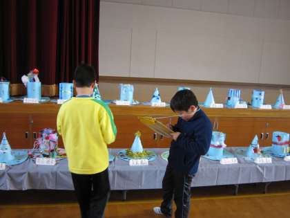 2年生の帽子の作品の前にいた子たちに,「君たちも2年生の時に帽子を作ったかな。」と聞くと,「うん作ったよ。」という子と「作ってないよ。」という子がいて,どっちかなと話していると,「作っていなかったよ,勘違いしていたよ。」
