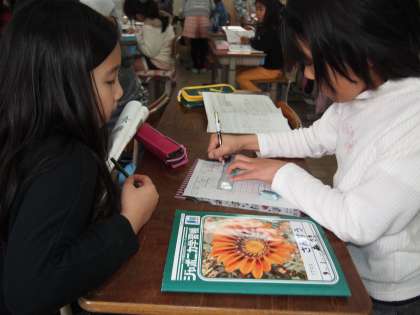 3年1組です。算数で先生が一通りの説明をした後で,子ども同士が教え得たり尋ねたりしながら理解を深めます。