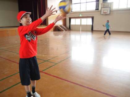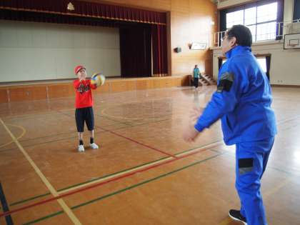 あおぞら学級です。体育館でそれぞれ子ども達が先生とキャッチボールをしています。