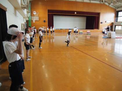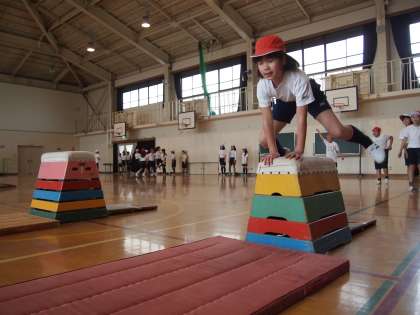 4年1組は跳び箱運動です。自分の力に合った高さに慣れながら,さらに高く遠くに跳べるように練習しています。