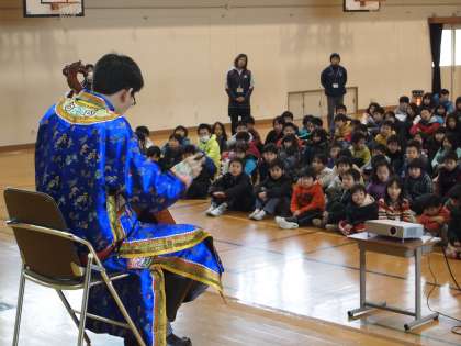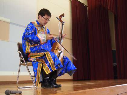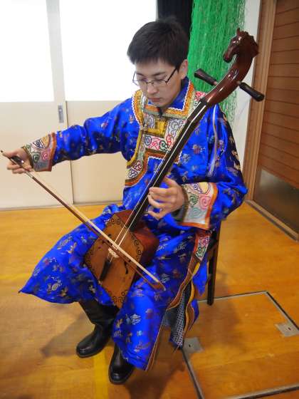 これが昨年2月に内モンゴルのボヤンさんに『スーホの白い馬』を馬頭琴で演奏していただいた時のものです。彼は今母国に帰って新たな勉強をされています。お元気だそうですよ。