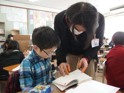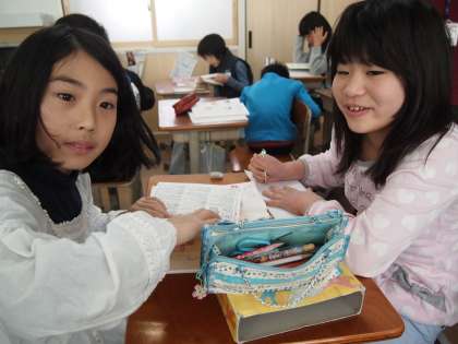 4年1組です。国語の学習で「ことわざブックをつくろう」にトライしていました。自分で,あるいは友だちと相談しながら進めています。国語辞典などを使ってあれこれ楽しそうにやっていました。
