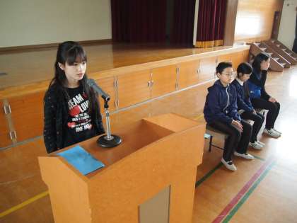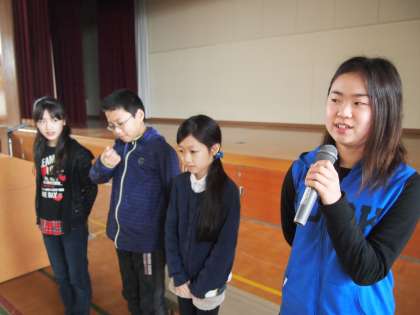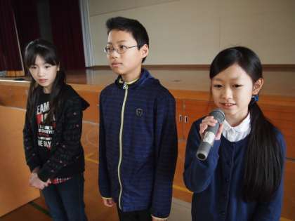 質問や感想の受け答えをはじめて練習しました。さすがに6年生は上手です。初めてでも今までのやり取りの様子が頭にインプットされていたのか,「質問を受ける」「答えて逆に質問する」「相手に答えてもらい,また質問を受ける」「答えてお礼を言う」という2往復のやり取りが自然にできていました。