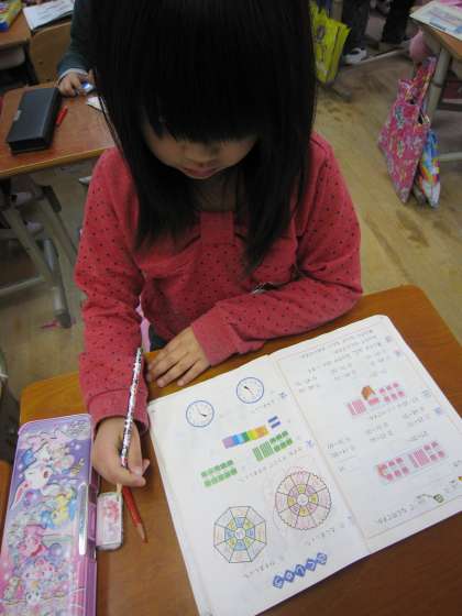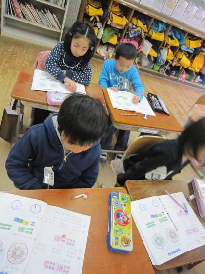 「10のかたまりが3つと1が7つでいくつ」や「今何時」という問題に取り組んでいました。