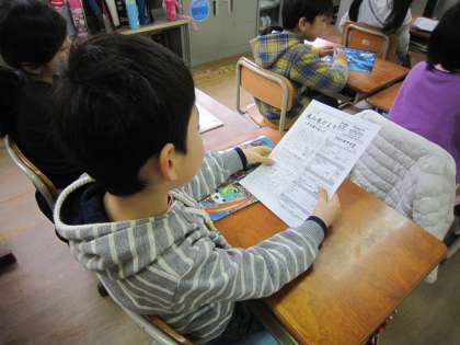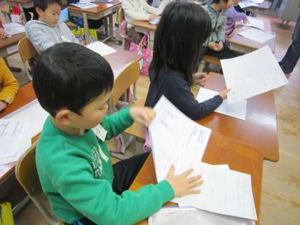 もらった学校だよりを熱心に読んだあと,丁寧に折って片付けていました。