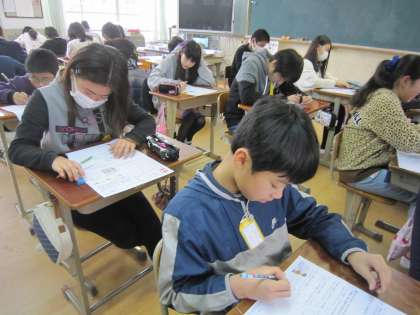 6年1組では,算数のテストに取り組んでいました。