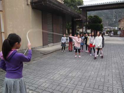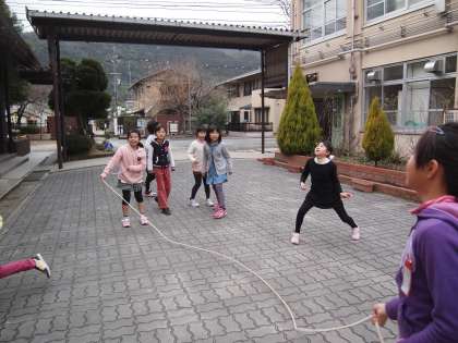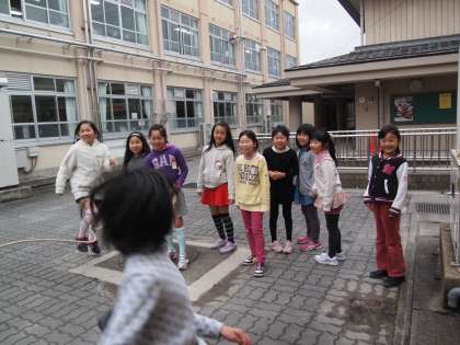 朝休みに3年生が楽しそうに大なわで遊んでいます。