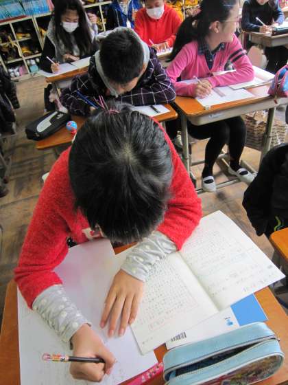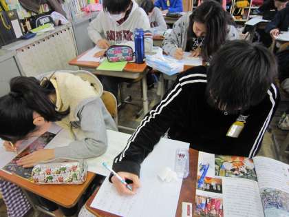 まとめるときには,日本とのつながりと生活の様子を中心にかくようにと指示を受け,新聞づくりに励んでいました。
