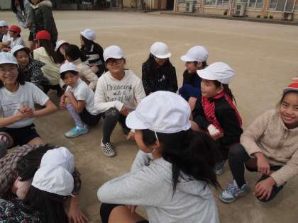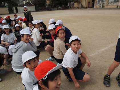運動場で5年生が集まっています。「なにしてんの?」「学年でけいどろするねん」今から始まるところのようです。