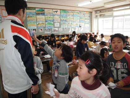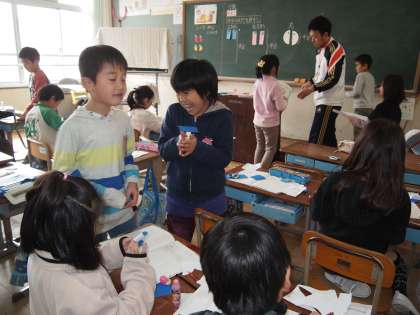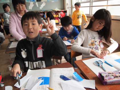 2年1組です。算数の分数の理解を進めるために折り紙を使っているところです。なるほど,こういう具体物を使うと分かりやすいですね。