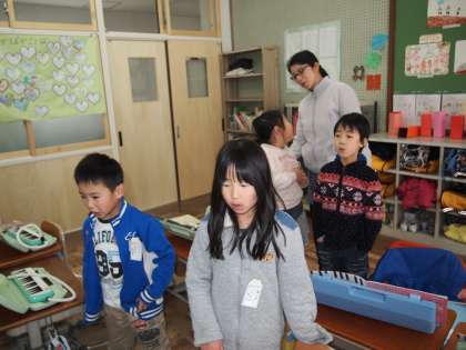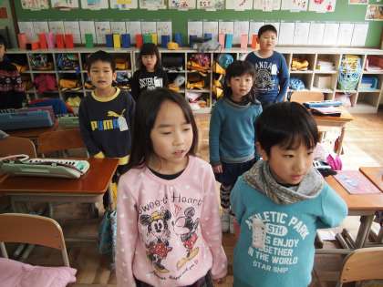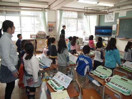 1年2組は音楽です。けんハモや歌の練習をしています。「6年生を送る会」に備えているのかな?