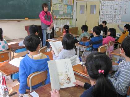 1年1組では,かんじノートを返した後,「だってだってのおばあさん」をみんなで音読しました。