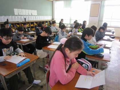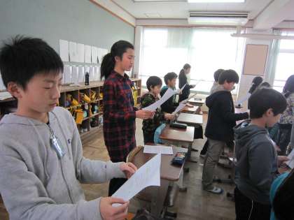 5年2組では,卒業証書授与式でいう門出の言葉の練習をしていました。