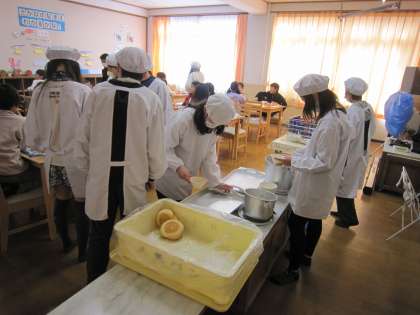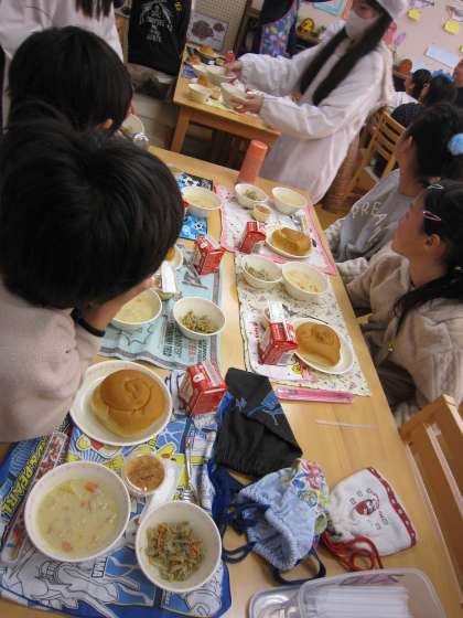 6年1組の子たちは,ランチルームで給食の準備をしていました。
