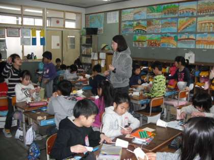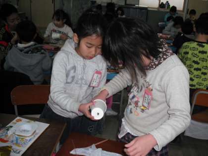 2年2組で紙コップとストローを使って人形を作りました。あおぞらの子たちもグループに入って交流しました。