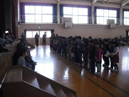 6年生へのプレゼント渡しです。プレゼントは5年生が中心になってたてわりグループのメッセージカードをはった色紙です。代表して1年生が6年生に渡してくれました。