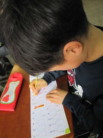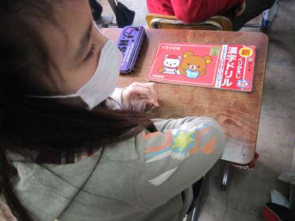 ドリルを1冊すべて書き終えると,写真の子のように金のシールを貼ってもらいます。