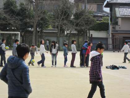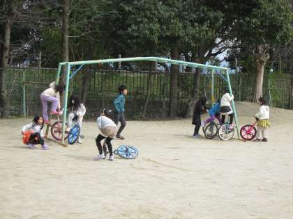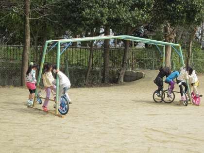 一輪車に乗ったり,列を作って何やら楽しそうに遊んでいる子たちもいました。