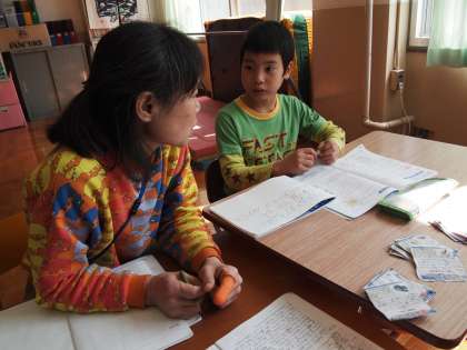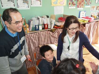 あおぞら学級です。授業の合間にふざけあったり笑いあったり…。算数の九九に取り組んでいる子もいました。