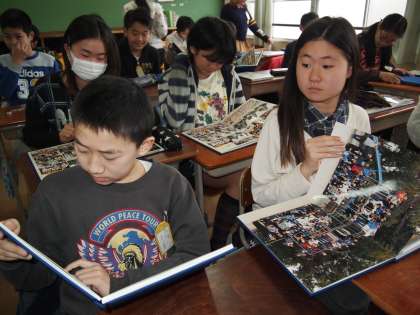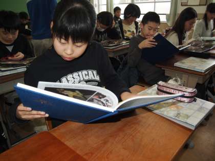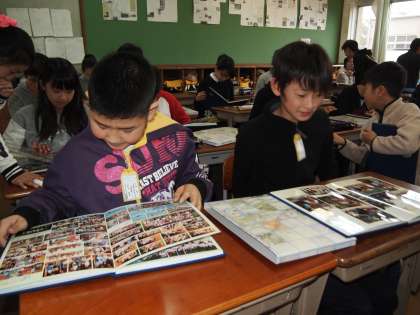 6年1組では手渡されたばかりの卒業アルバムを広げています。