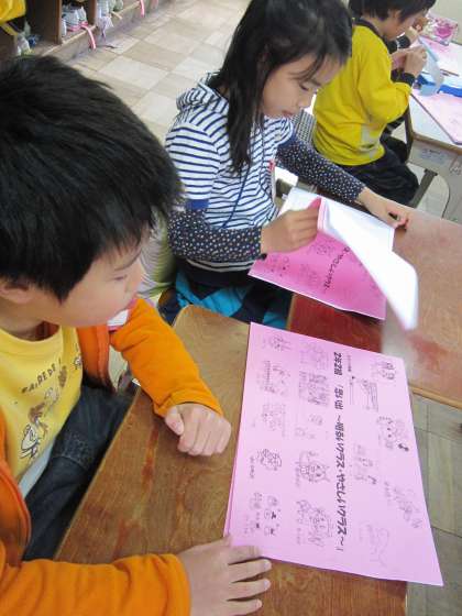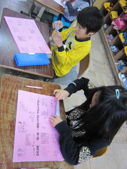 文集をもらった子ども達は,まず,製本テープを貼っていました。