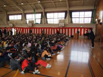 生徒指導主任の五十川先生から「4月の始業式も全員が元気で登校しましょう」と話がありました。最後は音楽主任の森先生のピアノで退場します。いつもピアノを弾いてもらいありがとうございました。