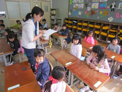 1年1組では,朝の会で机・いすの高さがあっているかを確かめていました。