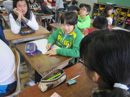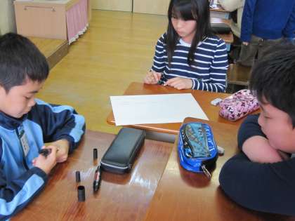 6年1組では,みんなで学級目標を考え出し合いました。そのあと,グループで話し合いをもちました。写真は,グループで話し合いをして,自分たちの考えたことを他のグループに伝える準備をしている様子です。