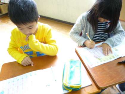 指書きは,ドリルの上ではなく,机の上で,顔の大きさと同じくらいの大きさで書いて練習しています。