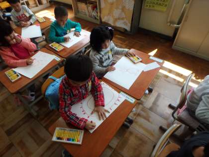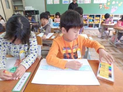 図工の「すきなものはなあに」の学習では,自分たちの好きなものを思い思いに描いていました。果物を描いている子,スポーツを描いている子,遊んでいる様子を描いている子など。どんな作品になったかは,参観日の時に見てあげてください。