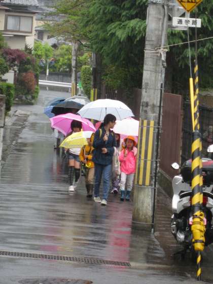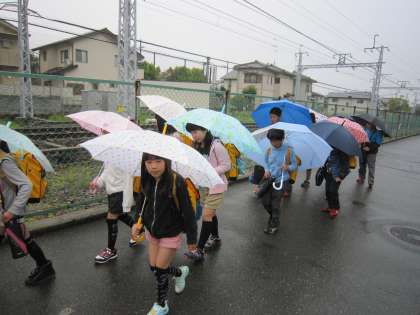 先頭を歩く高学年の子どもは,すぐ後ろの1年生を気にしながら歩いています。