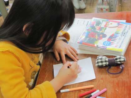 2年生は、目標を掲示するに当たって、文字の周りに子どもたちが自分の顔を描いた絵を飾ろうとしています。