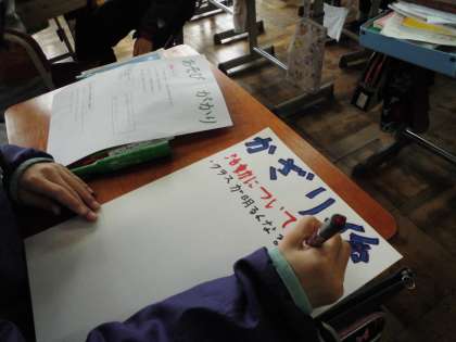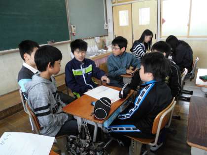 係活動をどのように進めていこうかとグループで相談しています。目的がはっきりしていると話し合いもスムーズに進みます。