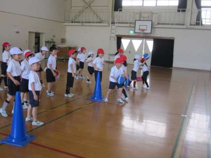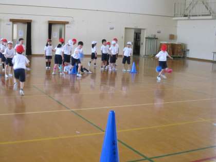 今日取り組んでいた「からだほぐし」の運動は,「行きはドリブル帰りはボールをもって」という運動をしていました。