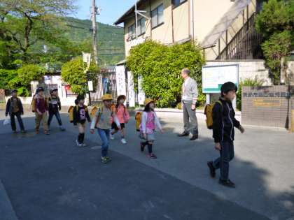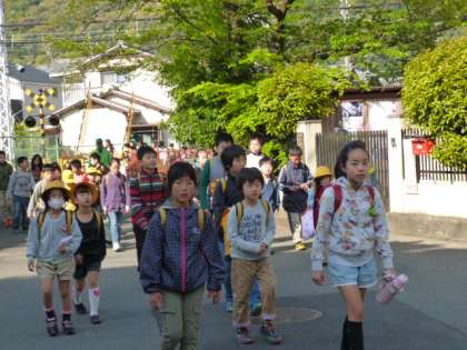 新学期がスタートし,新登校リーダー・班長が先頭に立って歩いてきます。