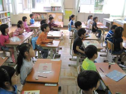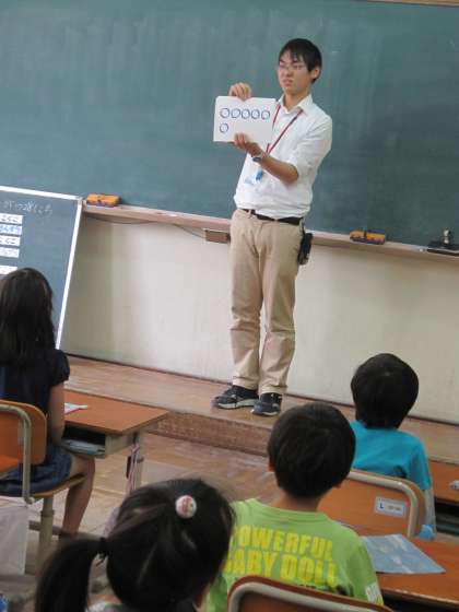 今日の2組では,「○○○○」の図を見て,「4」と答えることから学習を始めていました。物の数を見ていくつあるかと答えることは簡単そうですが,1年生にとっては練習が必要なことなのです。