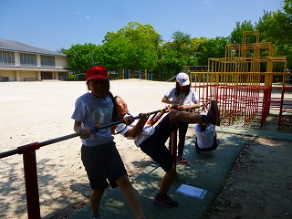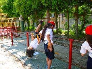 体育では,鉄棒学習をしています。「くるりんベルト」という黄色のベルトを使って逆上がりの練習をしています。ベルトでコツをつかんだのか,逆上がりができる子どもたちが増えました。