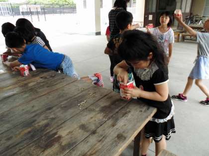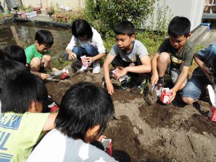 ひまわりとマリーゴールドの種を牛乳パックにまく準備をしました。