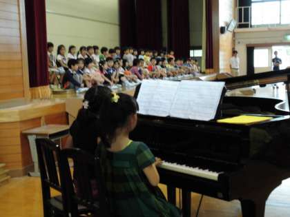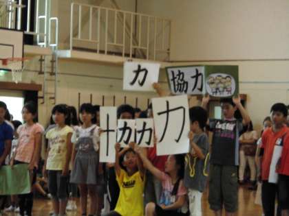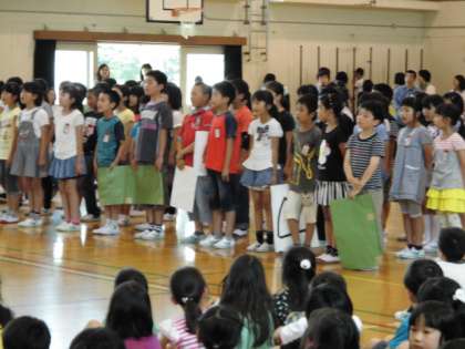 初めは4年生の出し物です。学年目標を上手く使って1年生にメッセージを伝えていました。曲目は,「はじめの一歩」です。