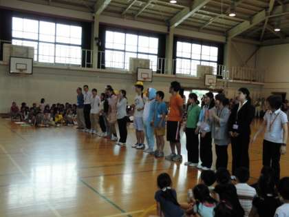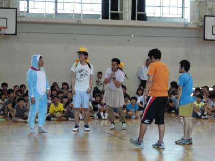 次に教職員からのサプライズ劇です。小学校1年生になったのび太がジャイアンやスネ夫から嫌なことを言われたときいつものようにドラえもんをよんで助けてもらおうとするが,「困ったときは正しいことを言ってくれる2年生から6年生,みんなにいろんなことを教えてくれる教職員のみなさんがいるから大丈夫」と諭され成長する物語です。個性豊かな俳優の演技力で大いに盛り上がりました。