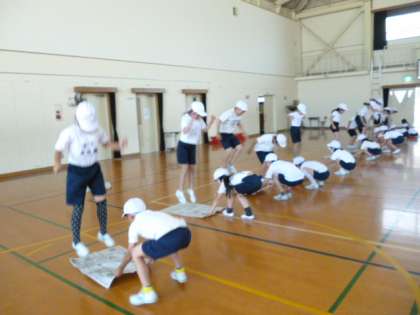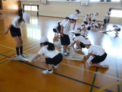 これは「新聞ジャンプ」です。新聞の上に立っている人がジャンプしている間にもう一人が新聞をひっぱり,移動します。