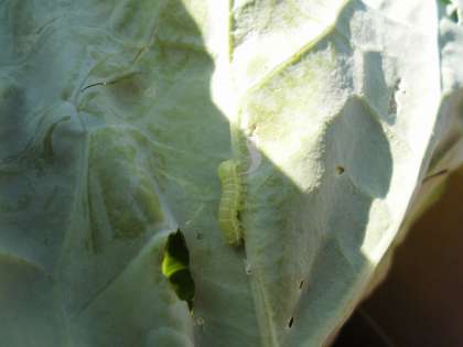 花壇のキャベツにアオムシを発見。3年生の学習ができますね。