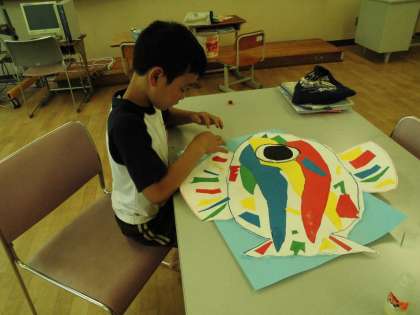 色画用紙を切って貼り付けて作りました。綿で雲も作りました。
