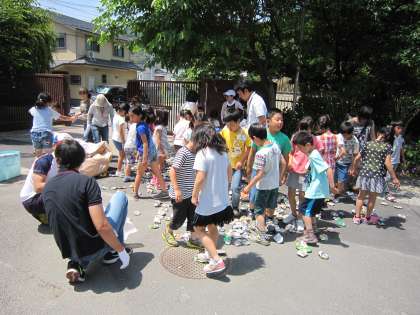 朝から子ども達や地域・保護者の方々がアルミ缶を持ってきてくれました。