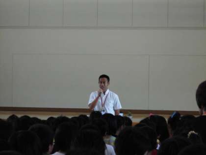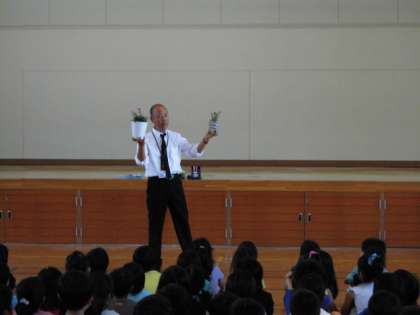 6月1日(月)いつもの朝会を5校時に行いました。学校長が花の器の大きさによる保水力の違いによって育つ花の大きさも変わってくることを例えて,「困ったとき,つらいときにどれだけ耐えられるか」たくましさを身につけることが大切だというお話をされました。