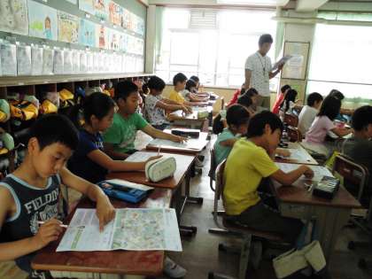 社会はワークシートで地図の見方の確かめをして,隣の子と交換して丸つけもしました。