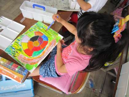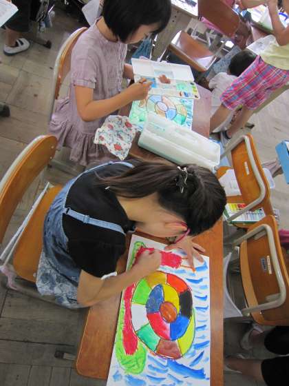 2年生は,自分用の絵の具を用意し,「かたつむり」に色を塗っていました。
