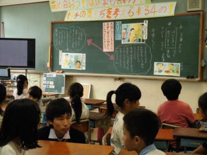 4年1組は道徳の授業で「友達のしょうこ」という資料を使って節度ある生活について考えました。4年2組は国語の授業でいろいろな意味をもつ言葉を集め,詩を作って発表しました。